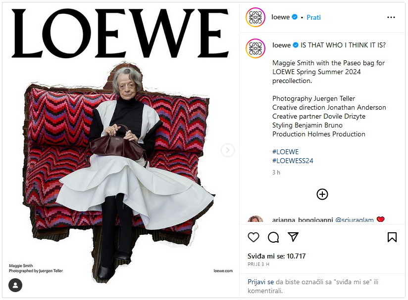 Luksuzna kuća Loewe na čelu s dizajnerom Jonathanom Andersonom sve je oduševila lansiranjem kampanje sa 88- godišnjom Maggie Smith u glavnoj ulozi.