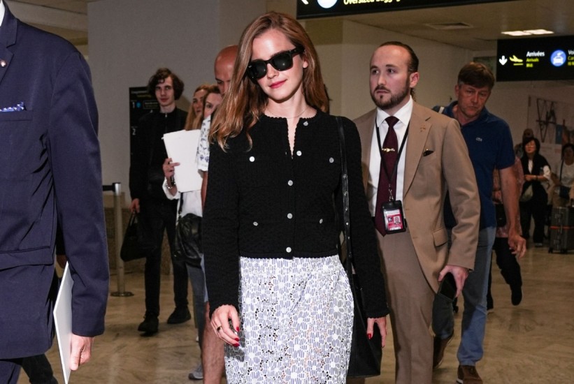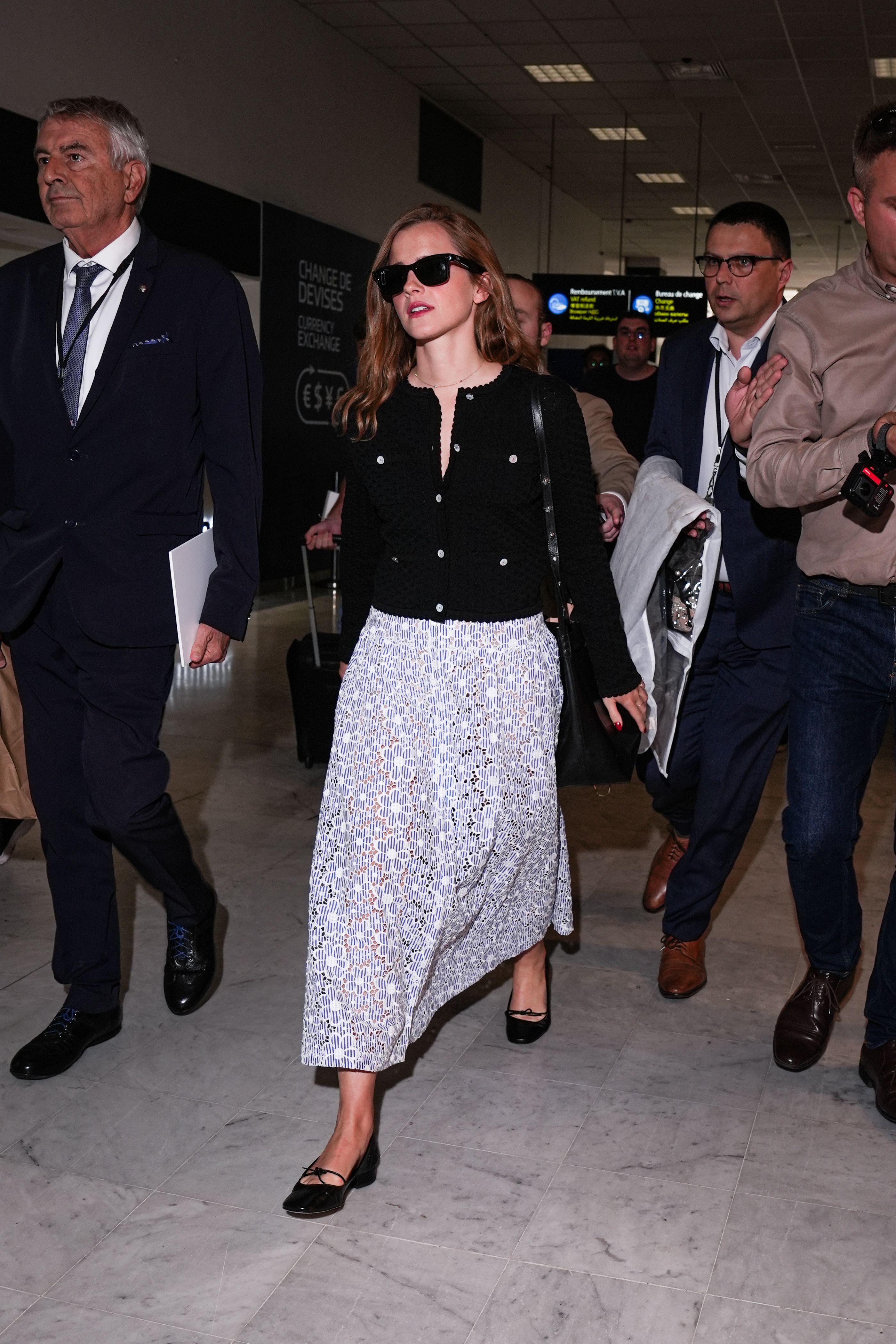 Britanska glumica, koja posljednje godine posvećuje studijima na Oxfordu, odabrala je za svoj dolazak na aerodrom Nice suptilan spoj klasike i romantike: crni kardigan koji ističe minimalističku eleganciju u kontrastu s bijelom suknjom od cvjetnog čipkanog tila. Na nogama – klasične crne baletanke, koje daju dozu ugodne lakoće i gradske šik note.