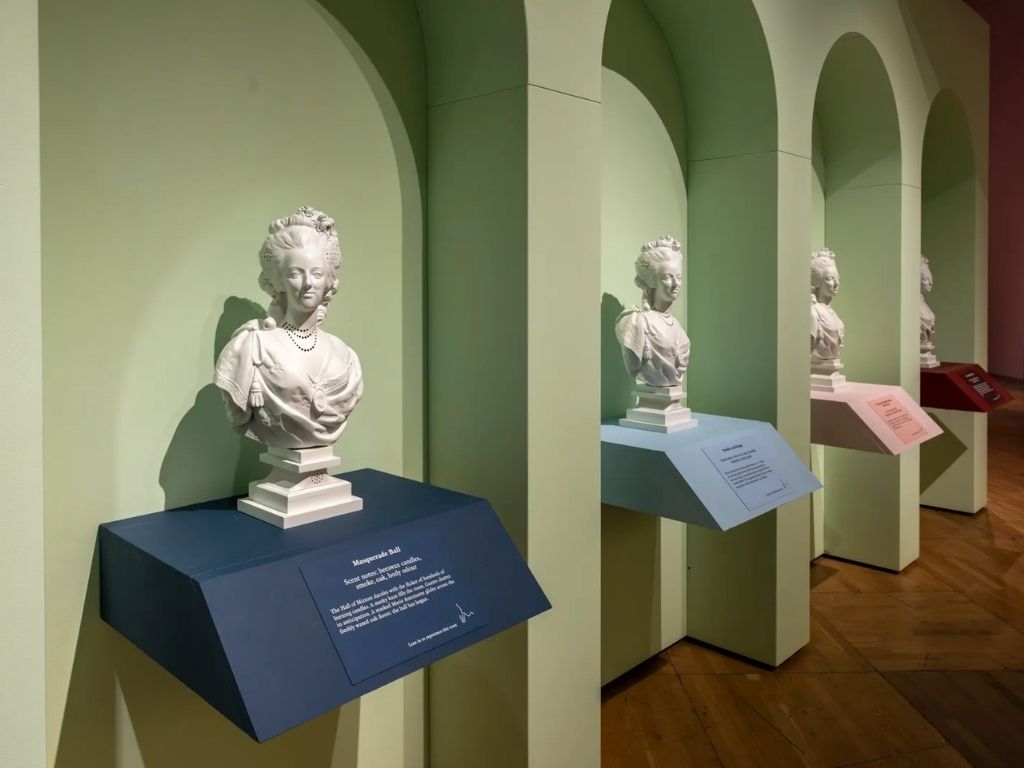 Jedan od najzapaženijih dijelova izložbe jeste mirisna instalacija: četiri parfemske skulpture predstavljaju različite faze Marijinog života – od luksuza Versailleske balske dvorane, preko cvjetnog vrta u Petit Trianonu, do zadaha tamnice i tragičnog kraja u zatvoru. Posljednji miris sadrži note plijesni, kamenja i dima – vjeran odraz njenih posljednjih dana.