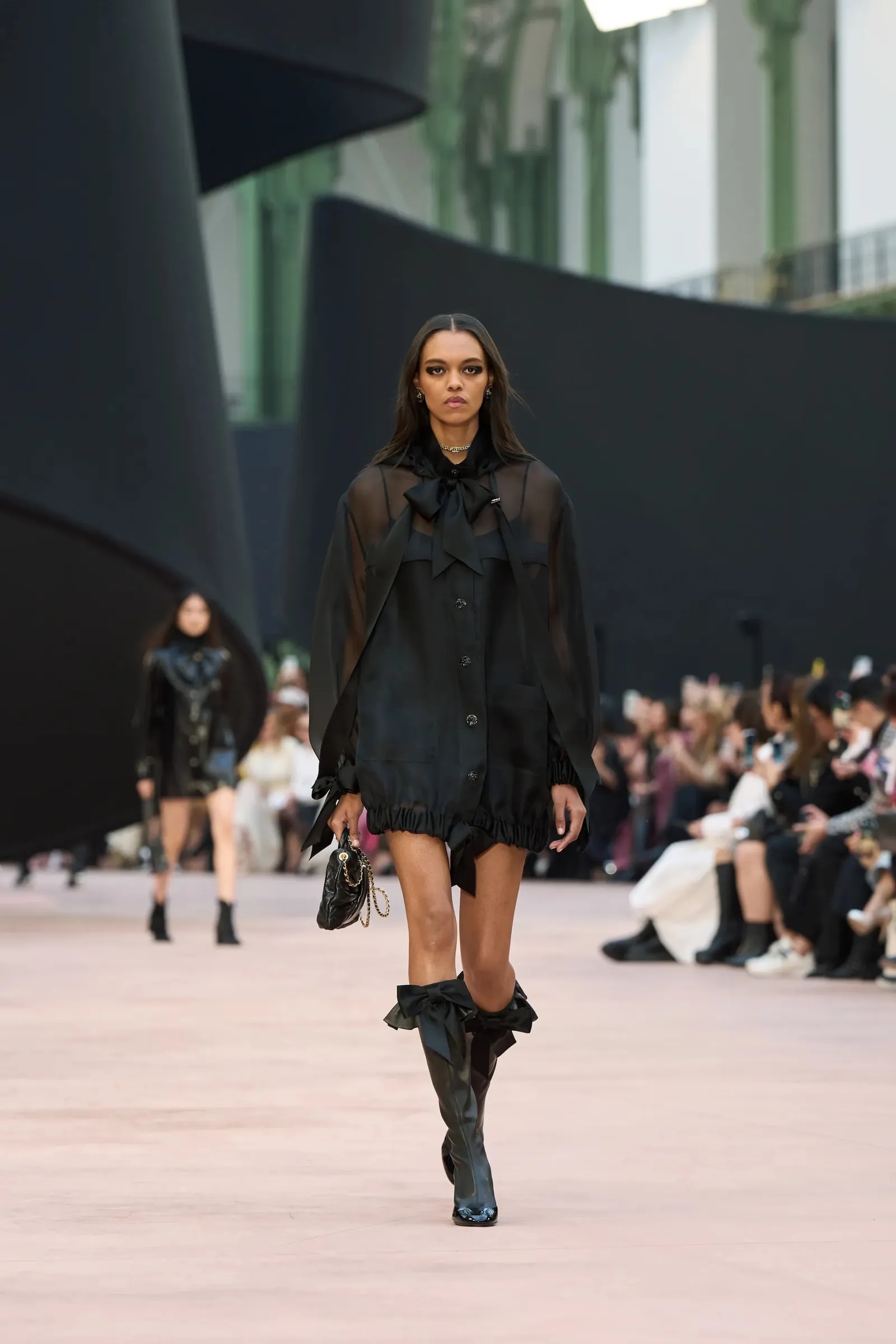 Kombinujte visoke čizme s mini haljinom i dobit ćete savršenu ravnotežu između zavodljivog i praktičnog za jesen. Chanelova kolekcija, posljednja dizajnirana u njihovom ateljeu, donijela je savršenu inspiraciju – kratku prozirnu košulju-haljinu i čizme ukrašene mašnama. Dokaz da i „tupi“ vrh može izgledati meko i ženstveno.