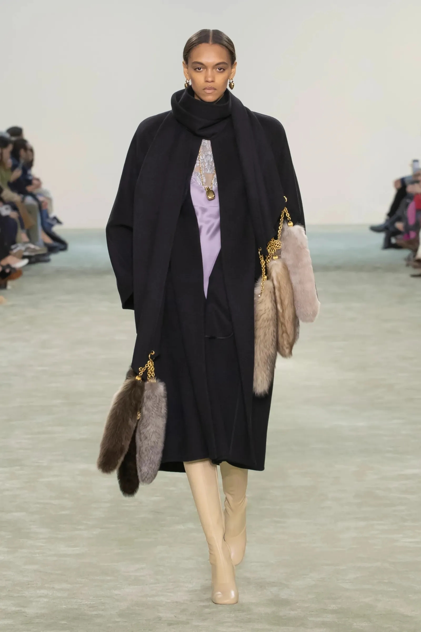 Na Givenchyjevoj reviji za jesen/zimu 2025. model Alex Consani prošetala je pistom u kaputu s balon-rukavima i širokim pantalonama od tkanine sa životinjskim uzorkom – a ispod su provirivali samo oštri vrhovi kvadratnih čizama.