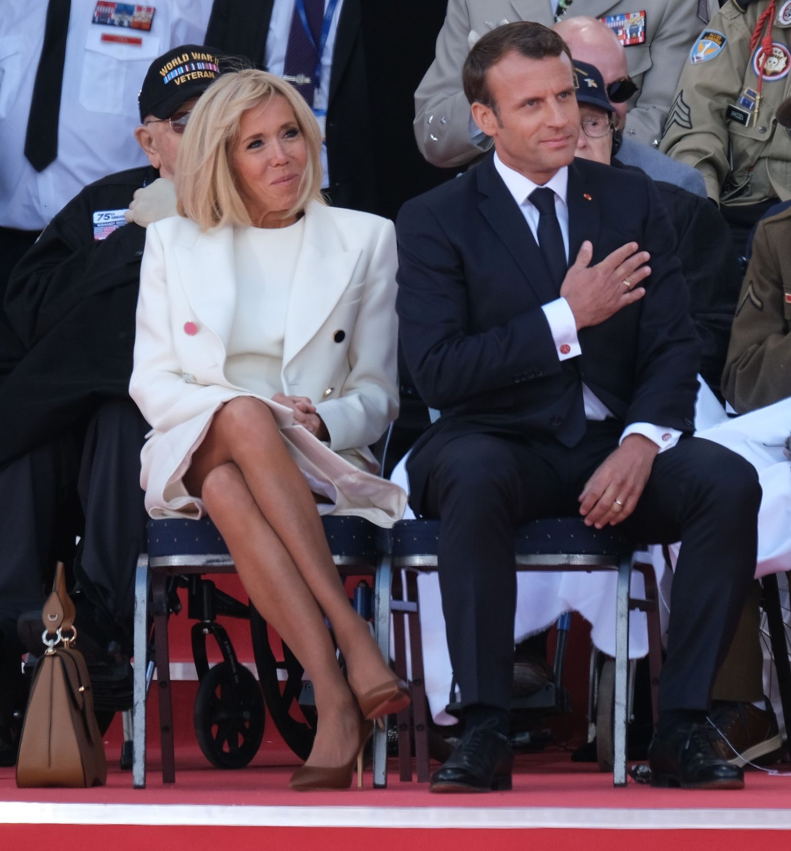 Prva dama Francuske za svečanost u Colleville-Sur-Meru je pak odjenula fini bijeli kaput ispod kojeg je nosila bijelu koktel haljinu, a bjelinu je "razbila" sa smeđim štiklama modne kuće Louis Vuitton čije cipele Brigitte Macron često nosi.