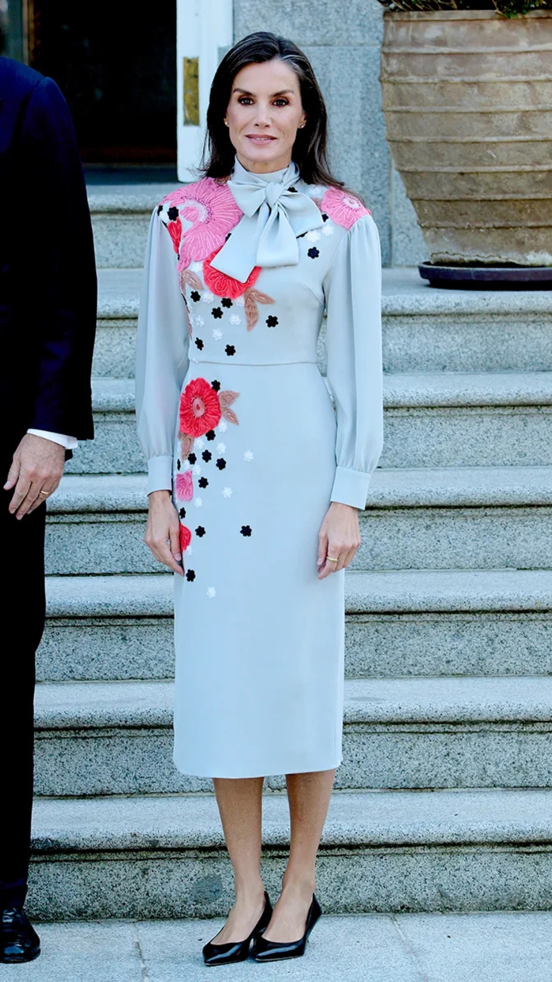 Za dnevni prijem, kraljica je odabrala sivkastu midi haljinu modne kuće Pertegaz, ukrašenu ručno vezenim cvjetnim motivima u nježnim tonovima ružičaste i smeđe. Ova haljina, koju je prvi put nosila još 2019. godine, danas ima dodatnu vrijednost — podsjeća na održivost, na to da prava elegancija ne zastarijeva. Uz jednostavne crne salonke i diskretne naušnice, Letizia je dokazala da profinjenost ne traži raskoš, već mjeru i samopouzdanje.
