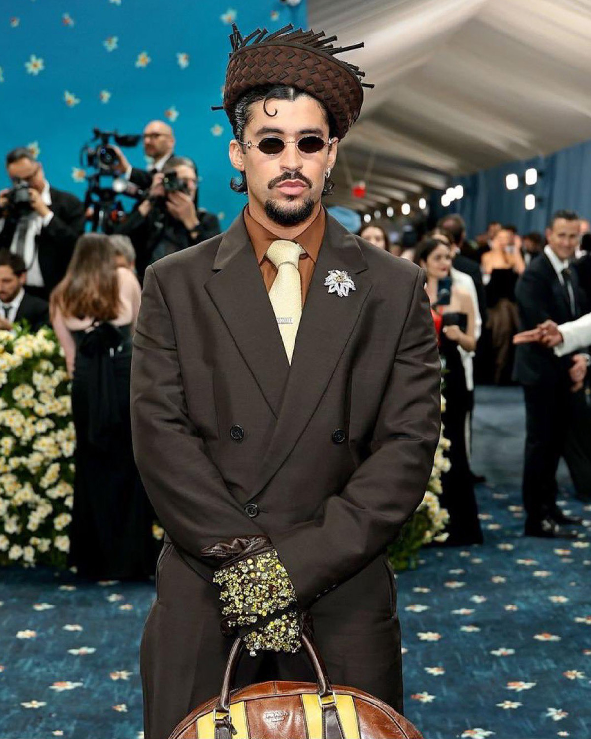 Najbolji outfit 2025.: Čokoladno-smeđi Prada komplet s pava-inspiriranom kapom na Met Gali.