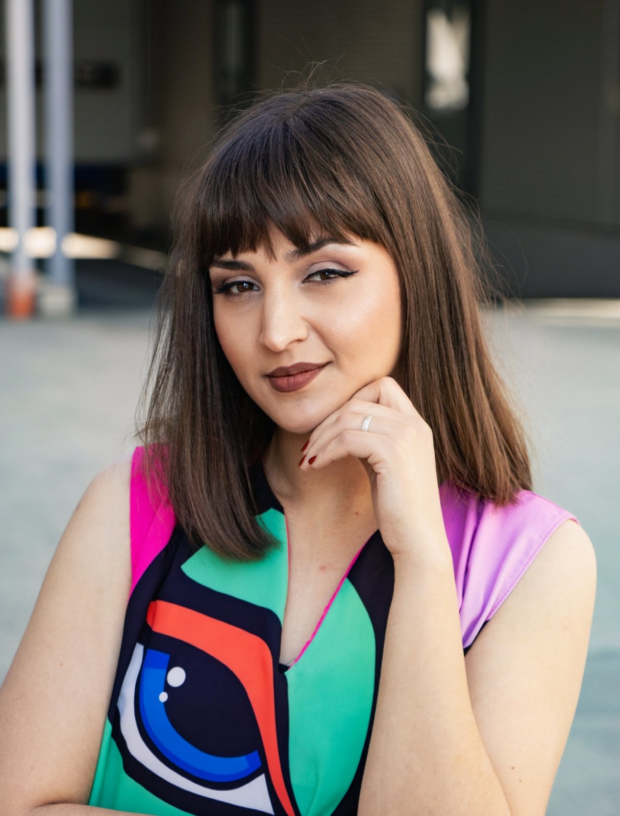 Aleksandra Radović njeguje klasičan stil s precizno ošišanim šiškama stilizovanim blago u stranu koje savršeno uokviruju lice i naglašavaju izražajne oči.