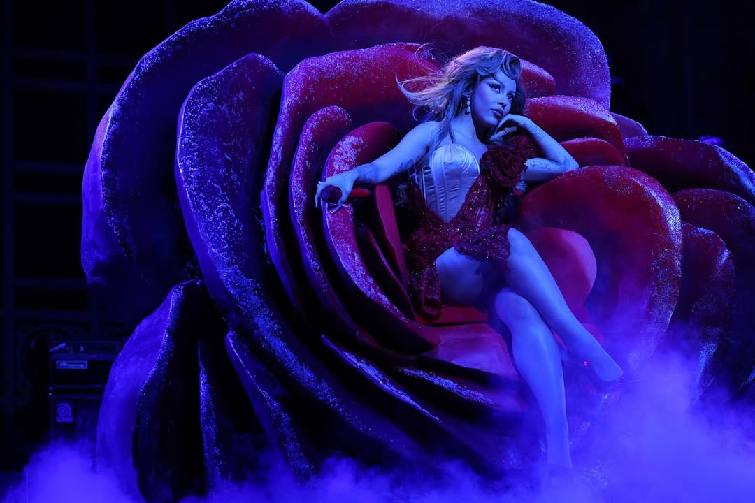 Za drugu pjesmu, “Gorgeous”, promijenila je ton u sofisticiranu senzualnost – nosila je korsetni bodi brenda The Blonds, ukrašen ružama od Swarovski kristala, uz bež najlonke i rubin crvene štikle. Svjetlucava, moćna i besprijekorno stilizovana – živjela je vlastitu “showgirl” fantaziju.