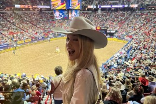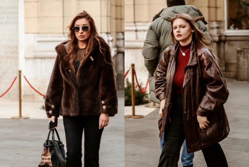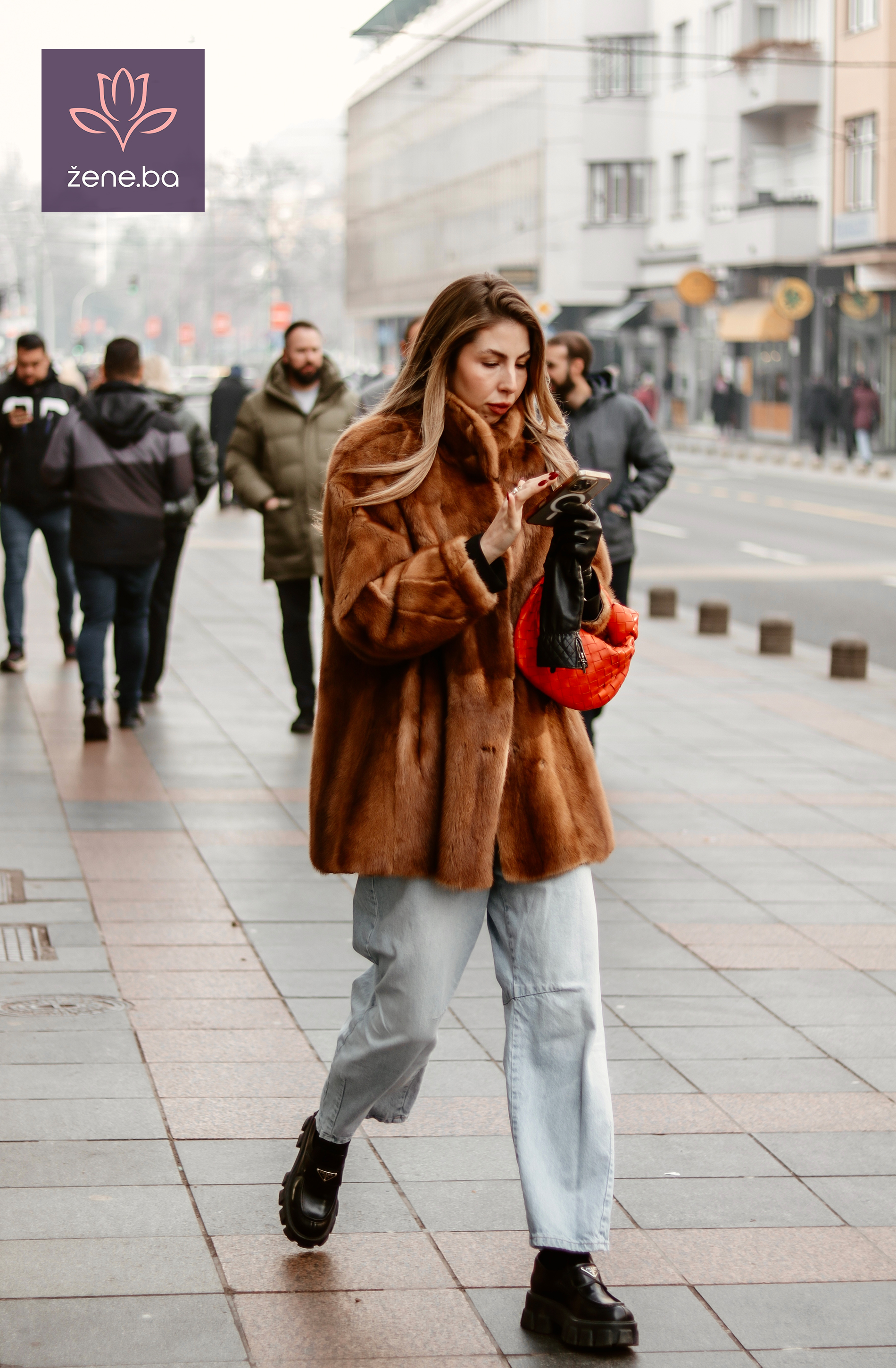 Jedan od outfita koji se lako primijeti je kombinacija tople smeđe bunde i svijetlih, širokih farmerki. Na prvi pogled jednostavno, ali pažljivo složeno. Crna obuća daje stabilnost cijelom izgledu, dok torba u jarkoj crvenoj boji unosi dozu razigranosti i čini outfit zanimljivim.