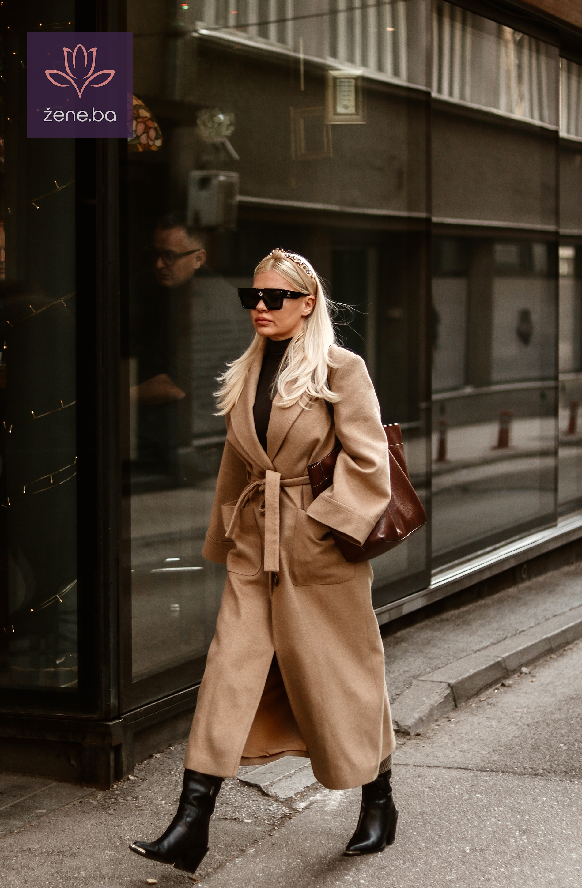 Bež kaput je već godinama nepogrešiv komad, a žene to stalno potvrđuju. Strukiran kroj, jednostavna crna podloga i čizme s potpeticom daju ovom outfitu uredan, ali nimalo dosadan izgled. Velika torba dodatno naglašava praktičnost, što je u gradskim šetnjama uvijek plus.