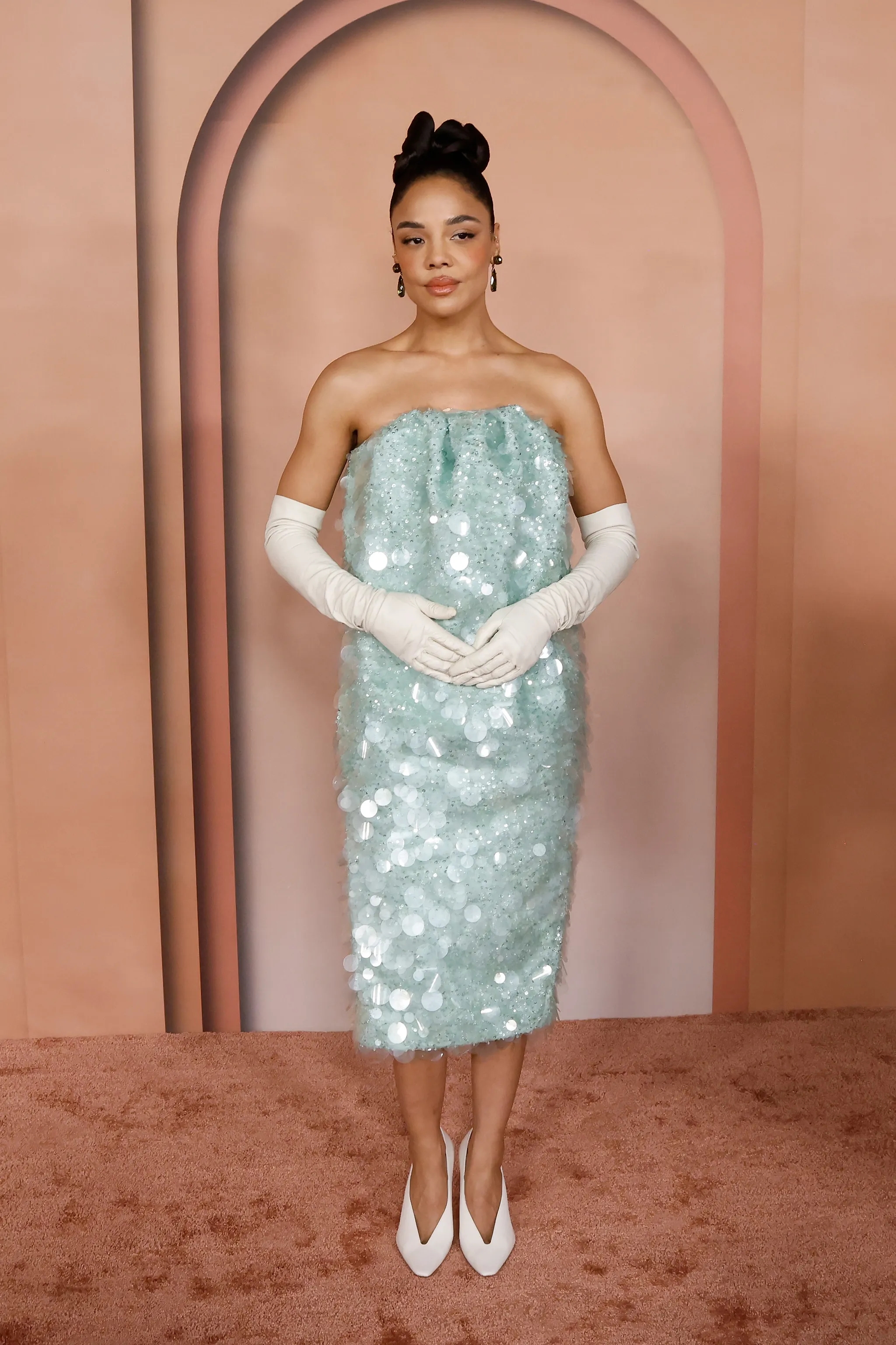 Uzmimo za primjer Tessu Thompson u njenoj Balenciaga haljini koja podsjeća na disko kuglu. Plava haljina bez naramenica bila je upečatljiva sama po sebi, ali zahvaljujući dugim rukavicama i špicastim salonkama koje je dodala, izgled je djelovao moderno i svježe.