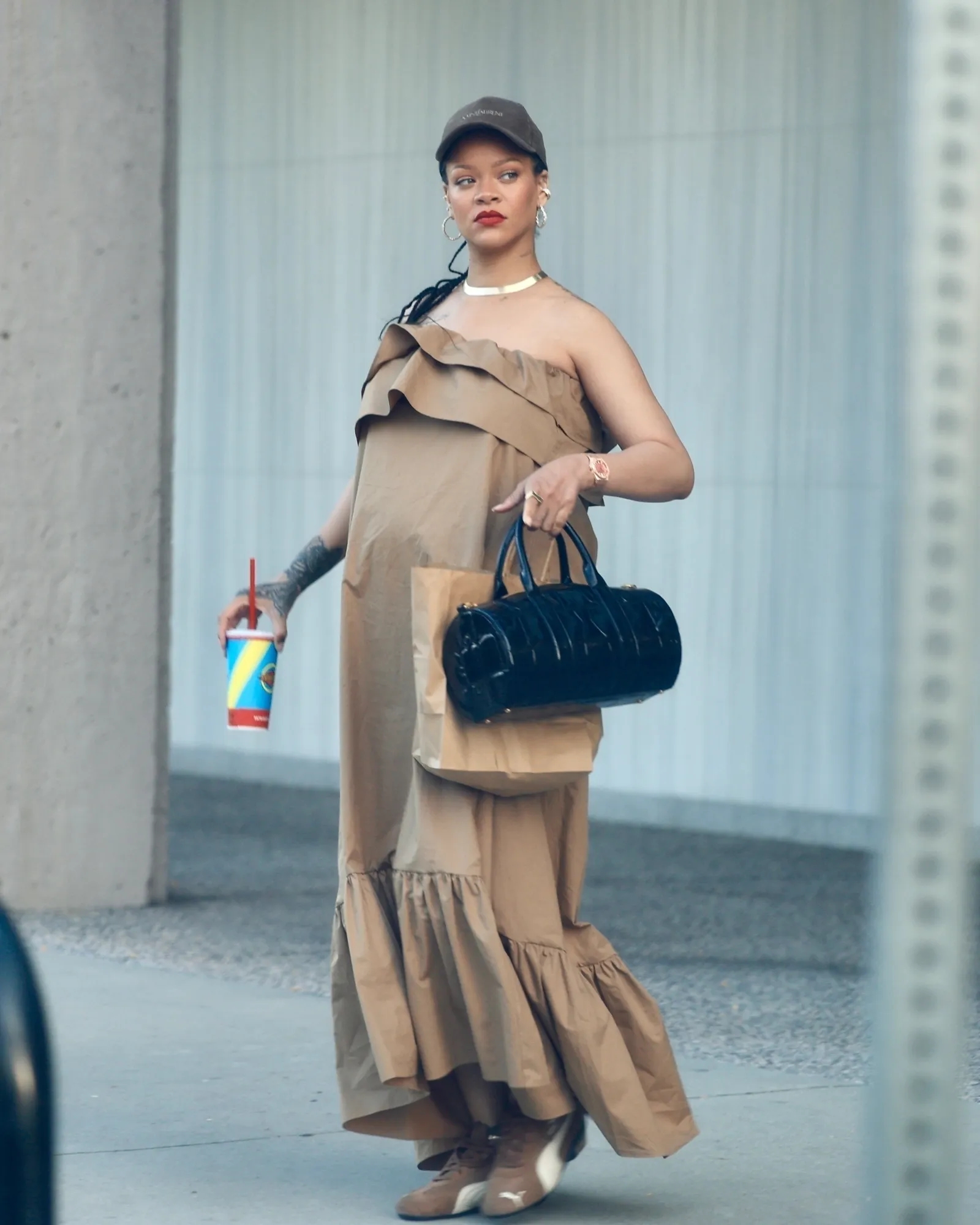 Ali čak i svakodnevni odlazak po fast food zahtijeva modni trenutak — što je Rihanna pokazala noseći Saint Laurent haljinu bez naramenica uz Schiaparelli torbu dok je kupovala burger i piće.