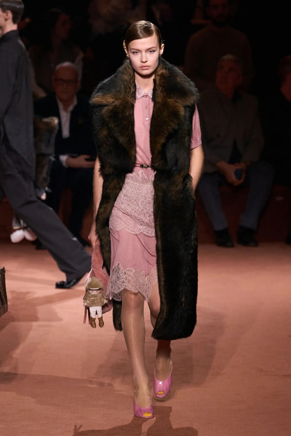 U Fendiju su nježni, donjim rubljem inspirisani komadi bili upareni s glamuroznim, holivudski stiliziranim lažnim krznom.