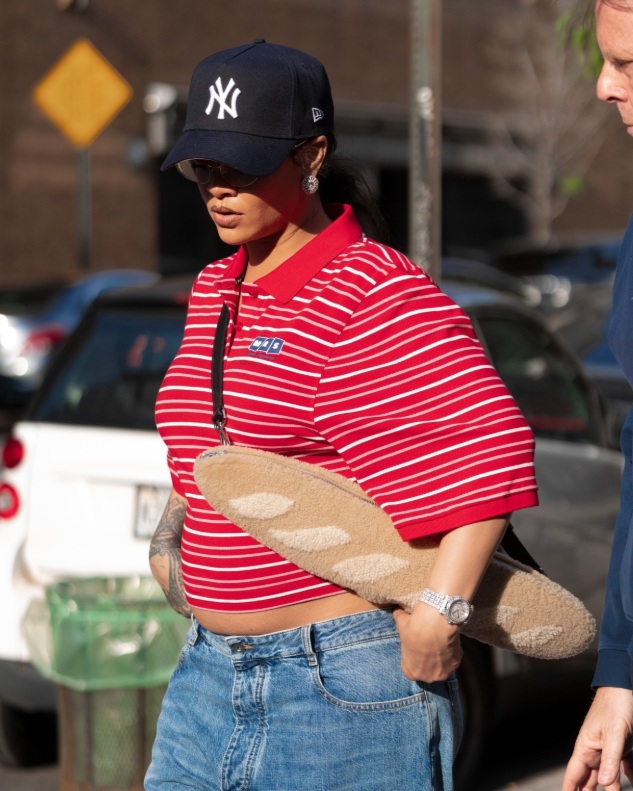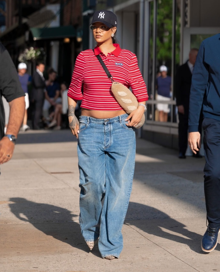 Ostatak outfita bio je jednostavan, ali prepoznatljivo Rihannin. Ležerne široke traperice spuštene taman toliko da naglase trudnički stomačić, prugasta crveno-bijela polo majica s potpisom Martine Rose, New York Yankees šilterica, Ray-Ban sunčane naočale i cipele sa zmijskim uzorkom, sve zajedno spoj francuskog humora i američkog street stila.