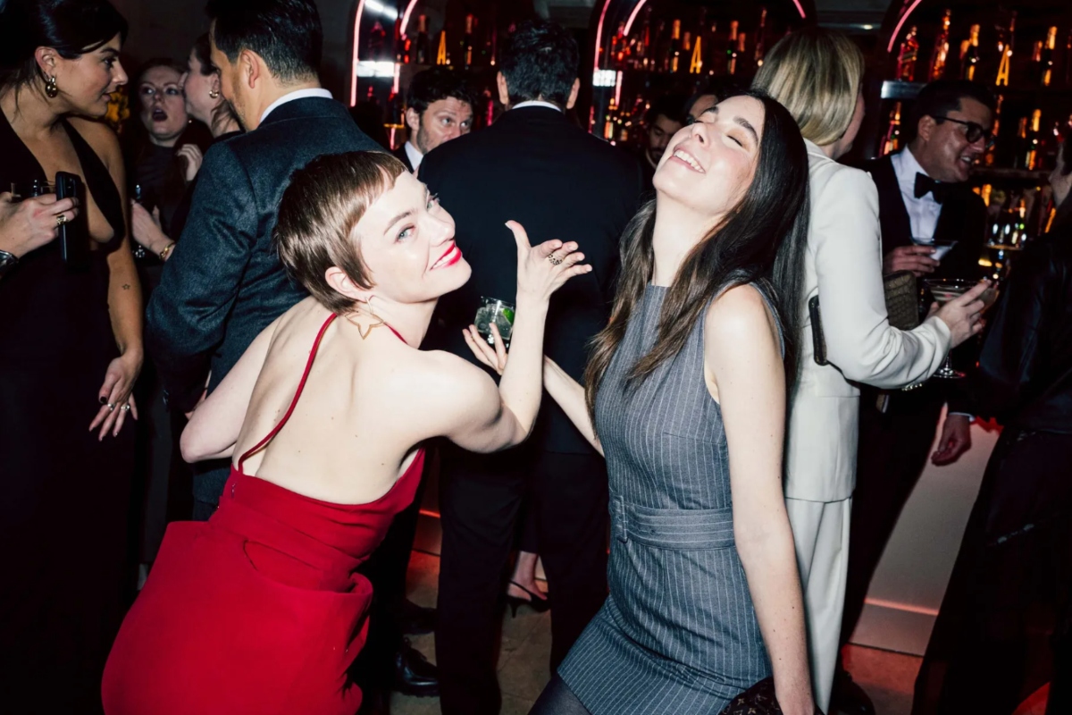 Na plesnom podiju, Emma Stone, koja je nosila "komične" džepove ispunjene kokicama, pozirala je u društvu s Alanom Haim, dok su se drugi zabavljali uz dinamične ritmove koje je stvarao Arcade Fire.