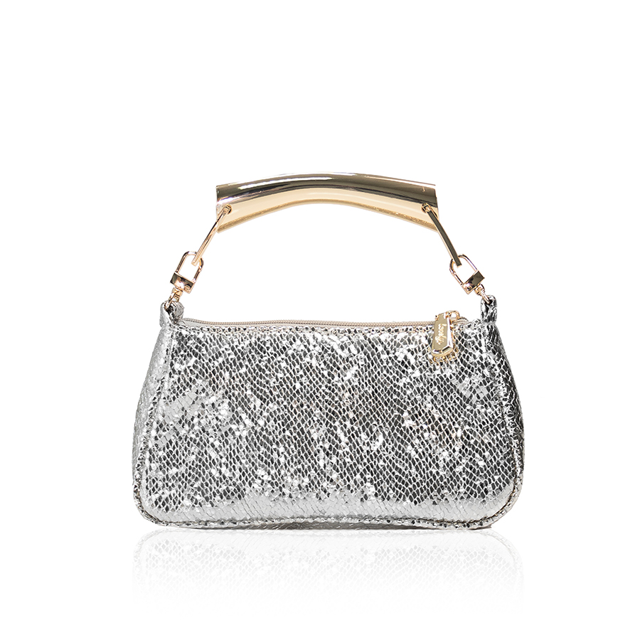 Torbica manjih dimenzija idealna za svečane prilike ali i svakodnevne kombinacije. Dodatni dašak luksuza donosi joj metalna ručka koja pruža kontrast mekim linijama.