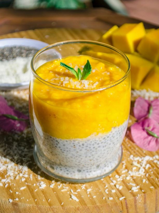 U zdjeli pomiješajte chia sjemenke, kokosovo mlijeko, napitak od badema, javorov sirup, vaniliju, sok i koricu limuna. Pjenjačom dobro izmiješajte kako biste spriječili grudanje. Ostavite smjesu u hladnjaku da odstoji barem 30 minuta, dok se ne zgusne.