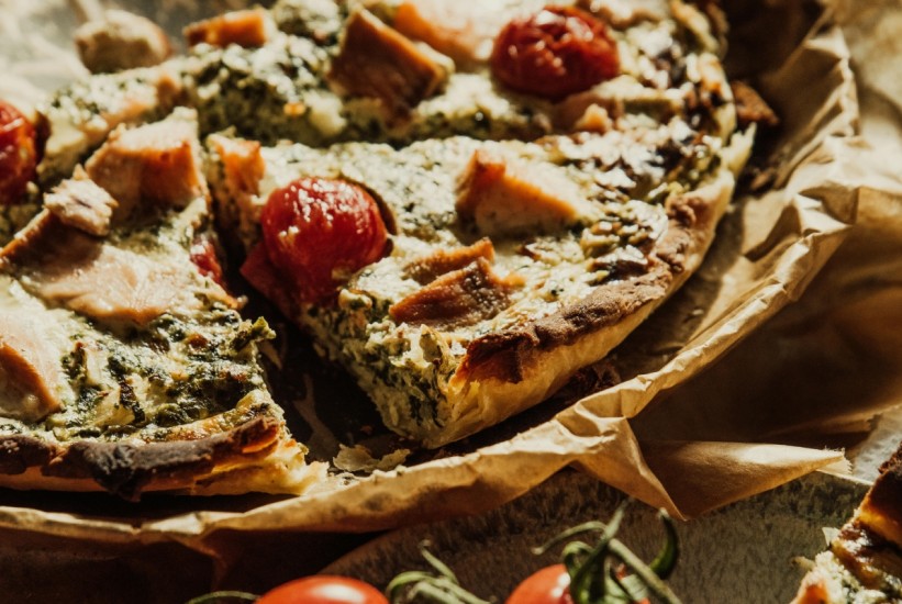 2. Na tavi kratko prepržite piletinu dok ne postane hrskava. U zdjeli umutite jaja, vrhnje, mlijeko, začine, nasjeckani paradajz, špinat i naribani sir. Dodajte piletinu i prelijte sve u predpečenu koru. Pecite 30–35 minuta na 180 °C, dok smjesa ne postane čvrsta i zlatno-smeđa.