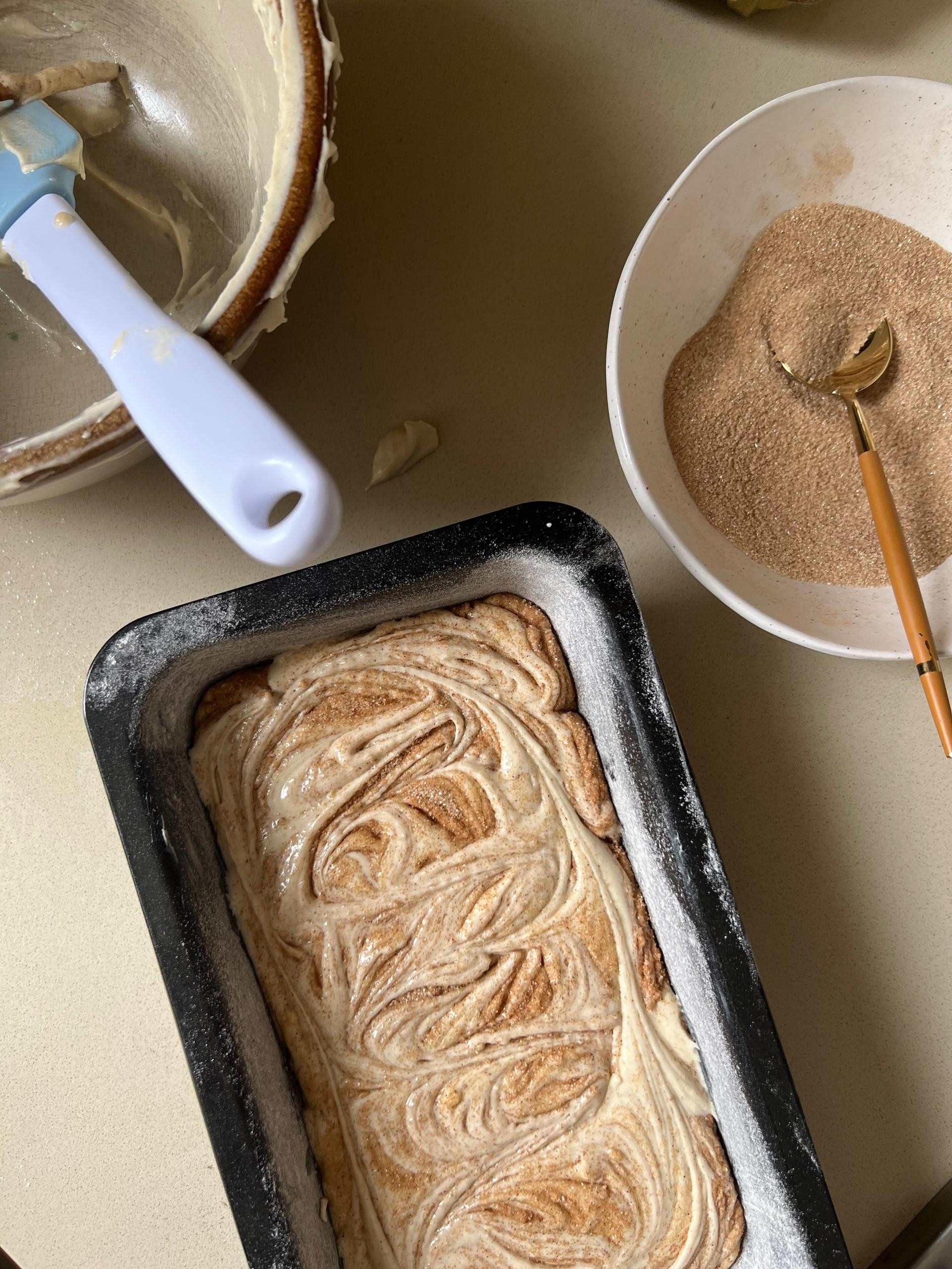 @chefamam Perfect winter treat🤎 Vanilla loaf cake with a cinnamon swirl, crunchy streusel and cream cheese frosting🫶🏼 Ingredients for the loaf: 275 g all purpose flour 1 tsp baking powder 1/2 tsp baking soda 1 tsp vanilla 100 g butter 200 g sugar 2 eggs, room tempature 200 g sour cream 2 tbsp vegetable oil 2 tsp cinnamon Ingredients for the streusel topping: 70 g all purpose flour 60 g brown sugar 1/2 tsp cinnamon 45 g butter, room tempature Ingredients for the cream cheese frosting: 50 g cream cheese 1 tsp vanilla 40 g powdered sugar 2 tbsp milk Direction: Start of by mixing all of the ingredients for the streusel together until it has a crumble texture. Set a side. Then make the cake by mixing sugar and butter together with a electric mixer. Mix until well combined. Add 1 egg at a time while mixing. Now add half of the flour and mix. Add the sour cream and vegetable oil and mix. Add the rest of the flour and also the baking powder, baking soda and vanilla. Mix. Divide the batter into to bowls and gently fold in cinnamon to only one of the bowls. Now alternate between adding the vanilla batter and the cinnamon batter to a prepared baking loaf pan. Then swirl the batter together with the end of a spoon or butter knife. Add the streusel on top and bake at a preheated oven for about 50 minutes to 1 hour. In the meantime make the frosting by mixing all of the ingredients together. Add the frosting on top of the cake when it is cooled. Enjoy!🤍#cinnamonswirlcake #cinnamon #cake #cinnamonroll #baking #recipe #foryoupage ♬ original sound - ems