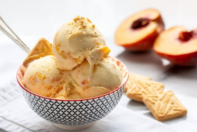 A za posebnu poslasticu, dodajte malo drobljenih prhkih keksića i malo cimeta - dobit ćete pravi Peach Cobbler sladoled!