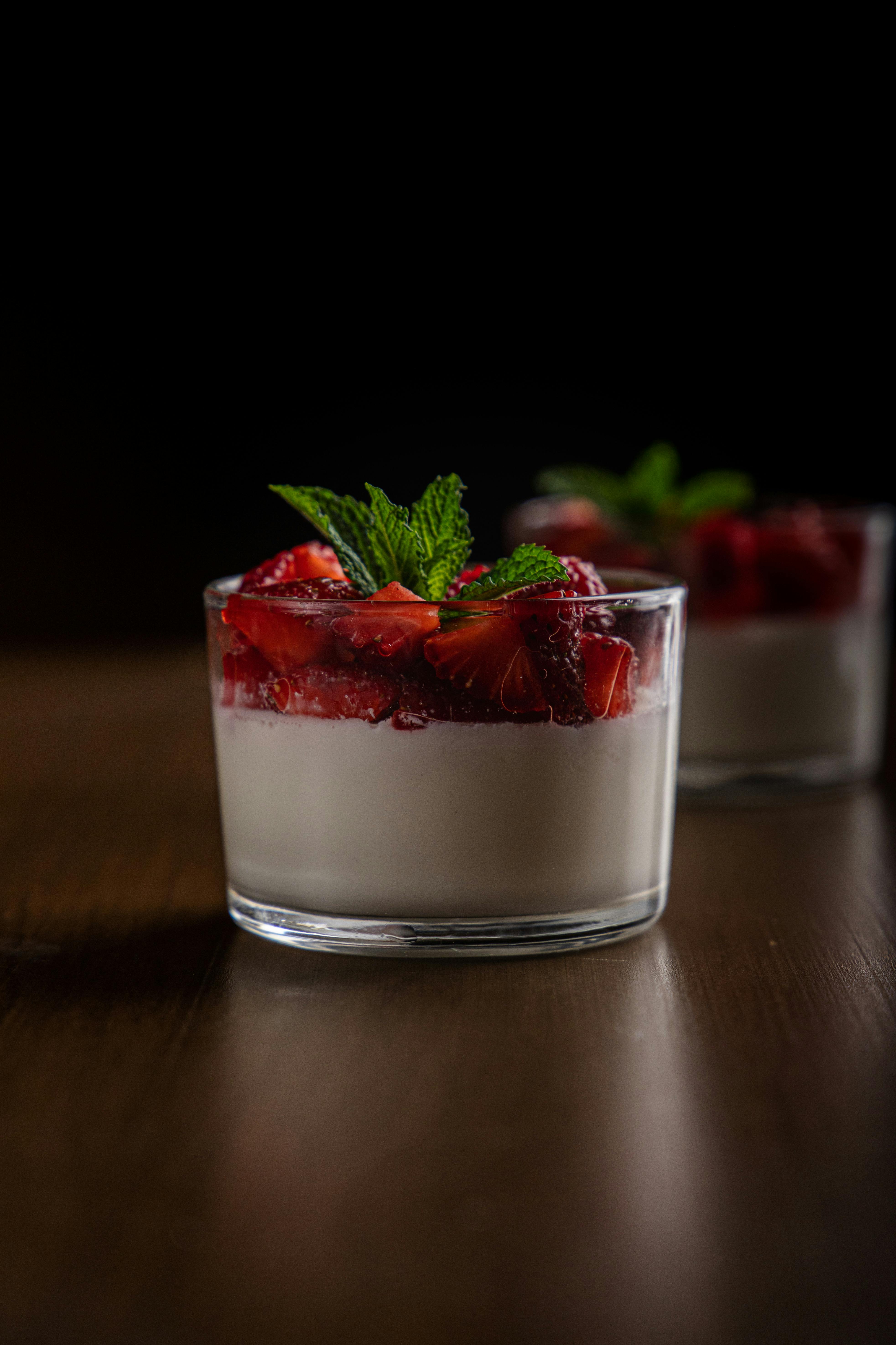 Panna cotta, omiljeni italijanski desert poznat po svojoj glatkoj, punoj teksturi i nenametljivoj eleganciji, u ovoj varijanti dobiva lagani, aromatični zaokret kroz svježe jagode, vaniliju i mentu.