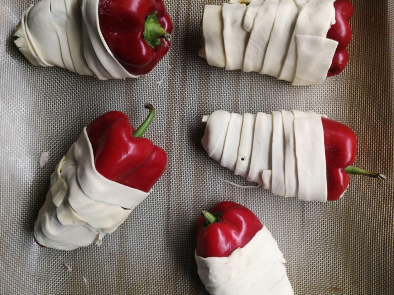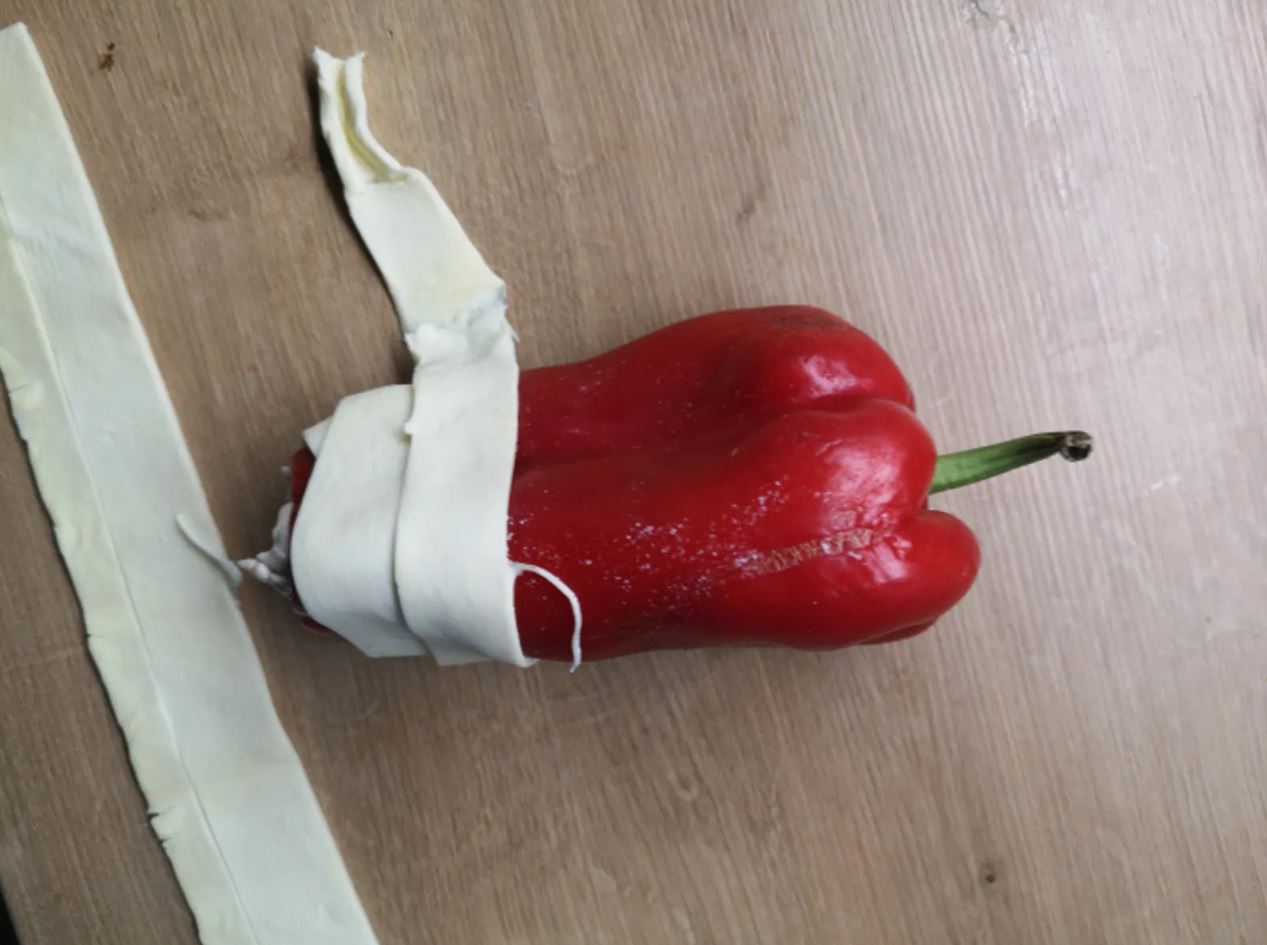 Lisnato tijesto razvaljati u veću kocku i rezati na duge trakice, tim trakicama zamotati papriku koju smo prethodno posolili.