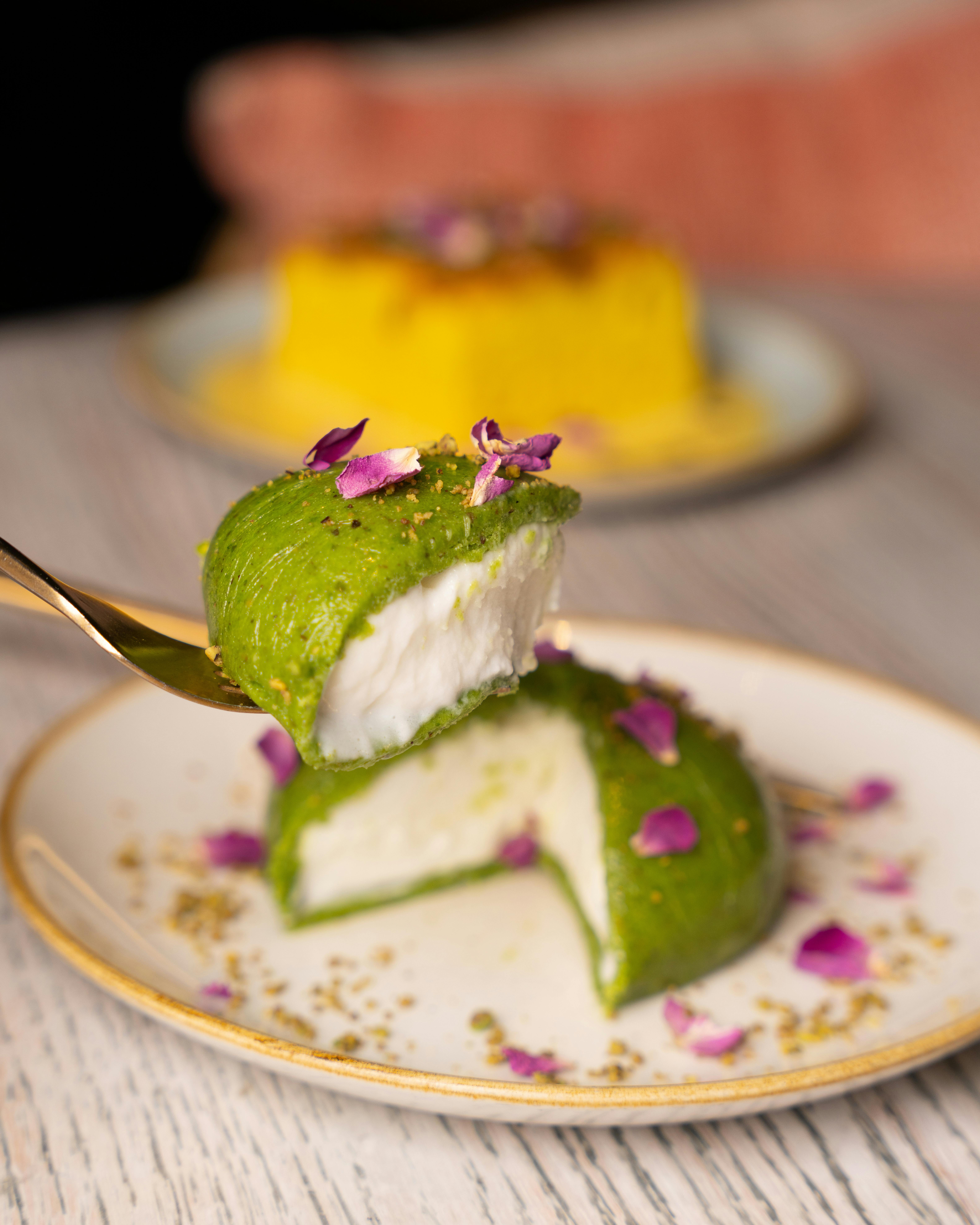 Desert savršeno spaja bogatu kremoznost pistacio moussea s nježnim bourbon vanilija gelatom, obavijenim sjajnom pistacio-glazurom.
