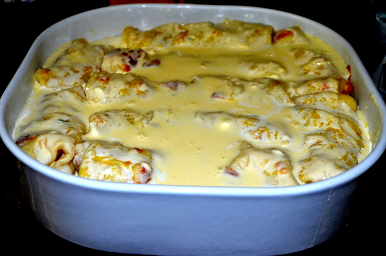 Namažite time palačinke, savijte ih i prelijte mješavinom pavlake, žumanca i soli. Zapecite.