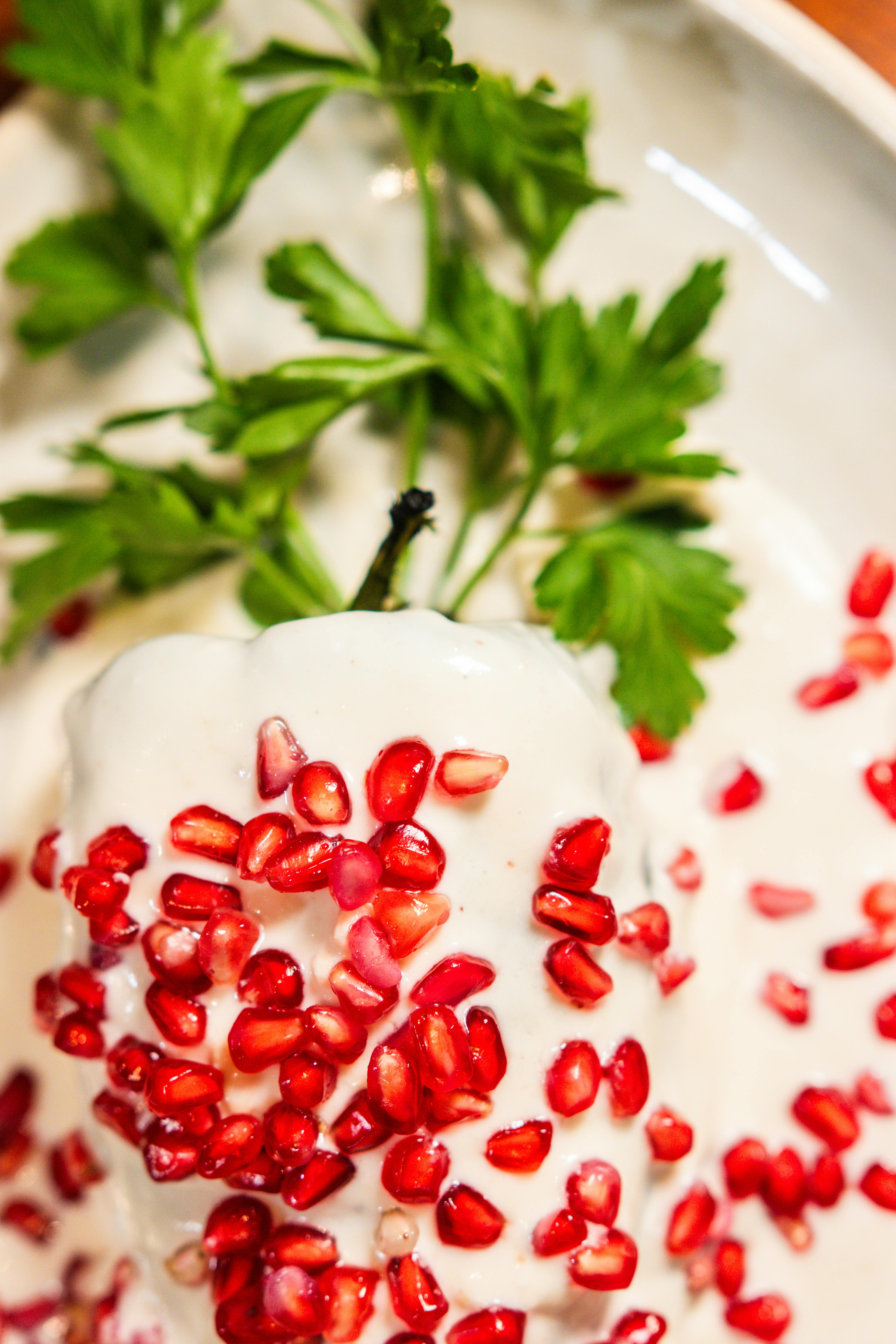 Paprike pažljivo složite na tanjiru, obilno prelijte nogada umakom. Ukrasite zrnima nara i pospite peršunom.