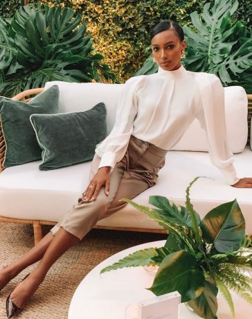Jasmine Tookes: kako nositi bluzu s ruskom kragnom u modernom izdanju?