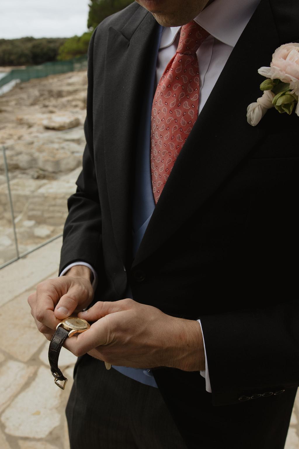 Mladoženja je nosio klasično skrojeno crno odijelo od finog italijanskog vunenog štofa, s teget plavim prslukom, bijelom košuljom i satenskom crvenom kravatom uz detalj ručno izrađenih broševa na reveru.