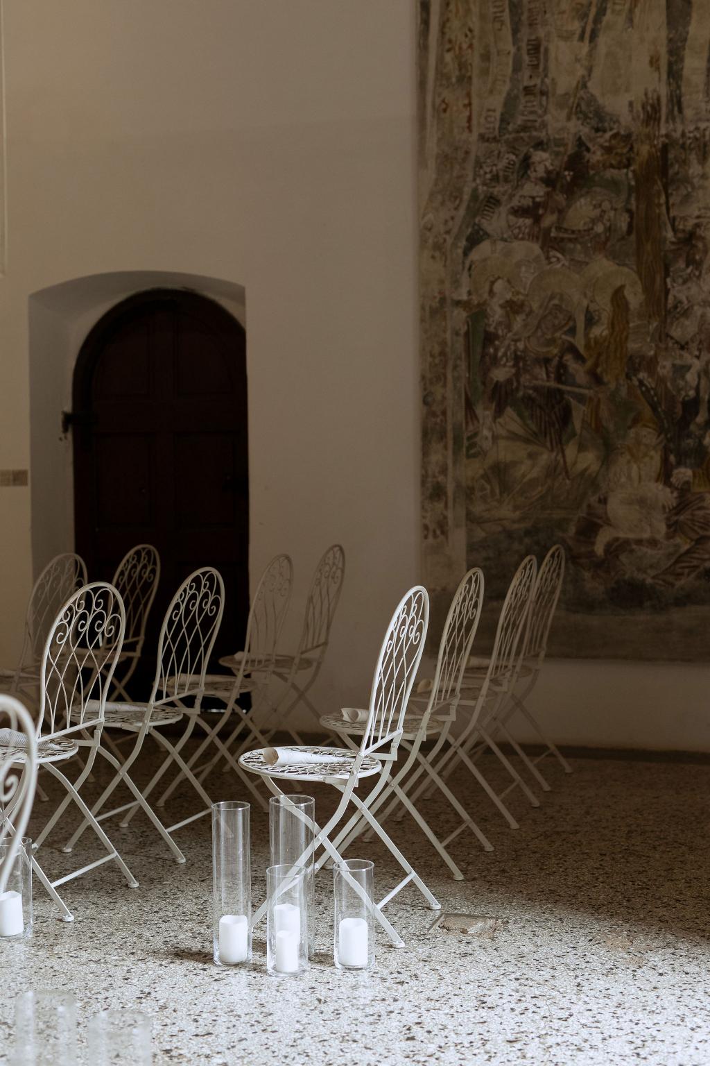 Dekoracija ovog vjenčanja bila je pravo umjetničko djelo. Na stolovima su se nalazili elegantni aranžmani bijelih ruža, peonija i lavande, koji su savršeno komplementirali raskošnu temu. Svaka stolica bila je ukrašena ručno rađenim trakama od satena, a svjetlo iz stropnih lusterja stvaralo je toplu i intimnu atmosferu.