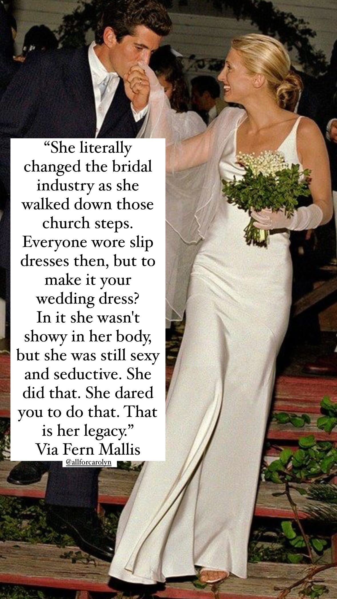 Njeno vjenčanje s Johnom F. Kennedyjem Jr. 21. septembra 1996. na ostrvu Cumberland u Georgiji bilo je obavijeno velom tajne, ali upravo zahvaljujući njenoj želji da se vidi haljina, javnost je dobila uvid u taj poseban trenutak.