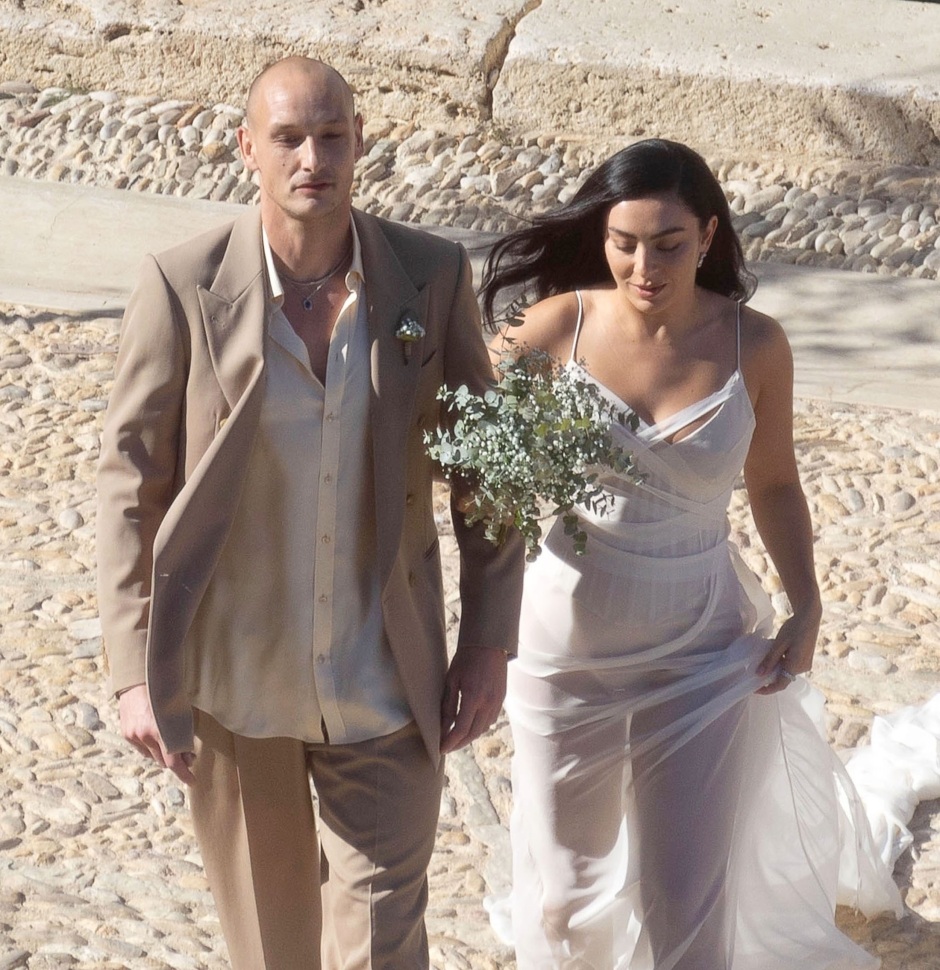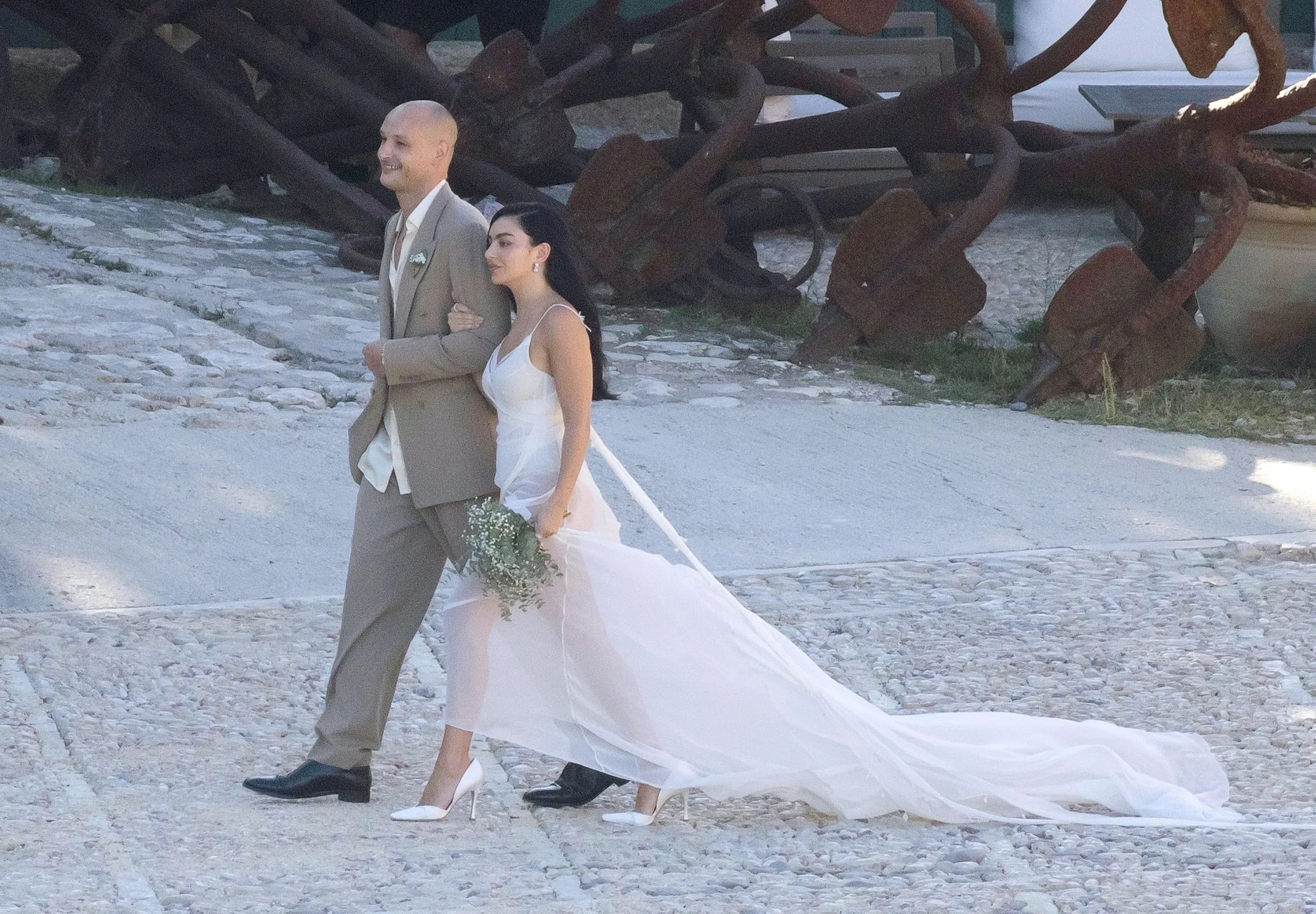 Za ovo vjenčanje, Charli je nosila prozirnu bijelu vjenčanicu s tankim naramenicama, kratkim V-izrezom i suknjom do poda s vlakom.