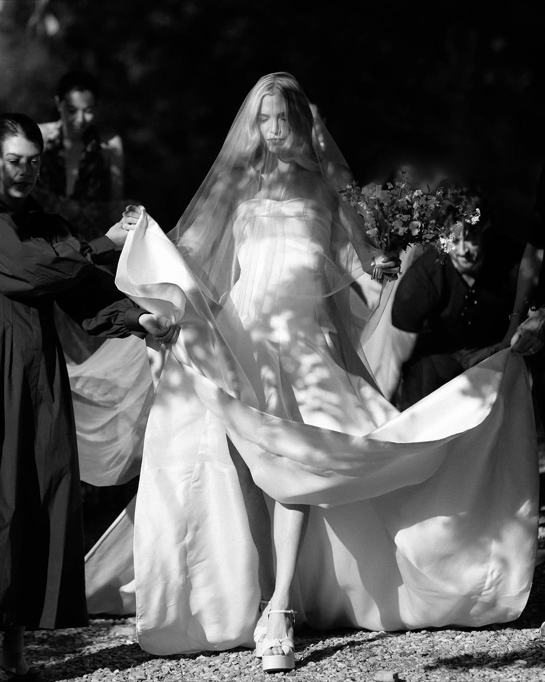 Haljina je bila spoj italijanskog luksuza i njujorške elegancije: izrađena od svile i pamuka, s ručno rađenim korzetom, lepršavim šlepom i velom od finog tula. Dizajn je nastajao šest mjeseci u saradnji s Hill House timom u New Yorku, a Allie je željela da haljina „bude bezvremenska, jednostavna i istovremeno posebna“.