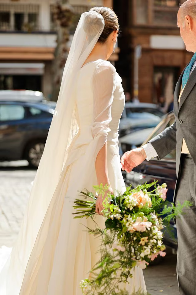 Umjesto klasičnog tila, Myriam je odabrala veo od dvostruke svile, što je dodalo sofisticirani i originalni ton njenom izgledu. Kosu je stilizirala u nisku punđu u balerina stilu, a buket je sačinilo poljsko cvijeće u pastelnim nijansama, ukrašen grančicama šparoge, popularnim izborom među modernim mladenkama zbog romantičnog i prirodnog dojma.