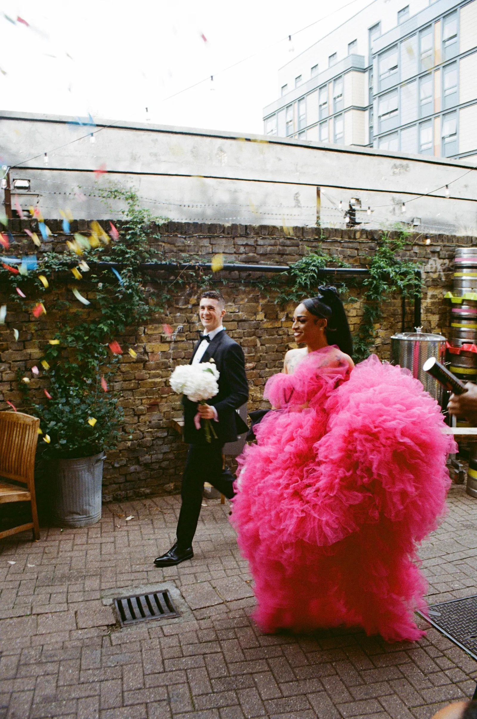 Par se vjenčao u Hackney Town Hallu, mjestu koje je postalo omiljeno među queer parovima u Londonu. „Uvijek sam zamišljala kako poziram na tim stepenicama. A i naš matičar je nosio Pride traku – to mi je bilo preslatko“, ispričala je Alex.