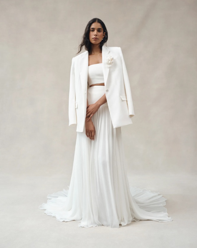 Elie Saab, poznat po svojoj raskošnoj estetici, predstavio je vjenčanicu koja spaja klasičnu siluetu s bogatim detaljima. Haljina izrađena od najfinijih materijala s ručno izrađenim vezom i aplikacijama od kristala pruža utisak luksuza i elegancije.