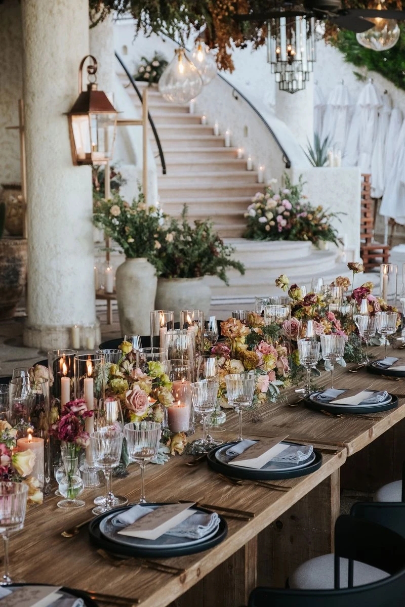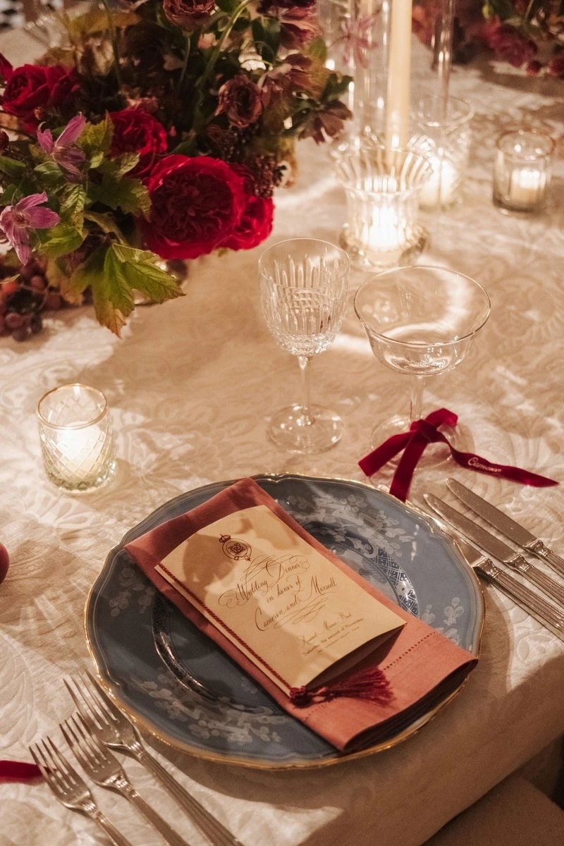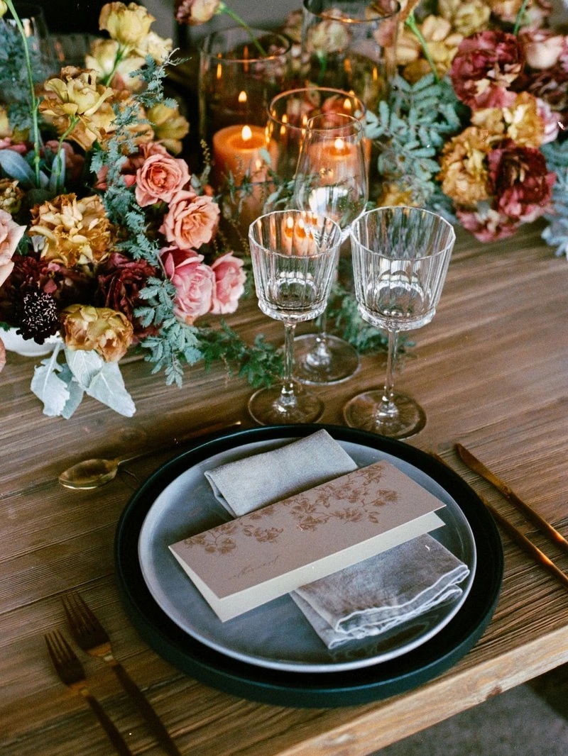 Zatim dodajte boju i karakter – personalizovane salvete, moderne tanjire, zanimljive menije ili asimetrične kartice s imenima.