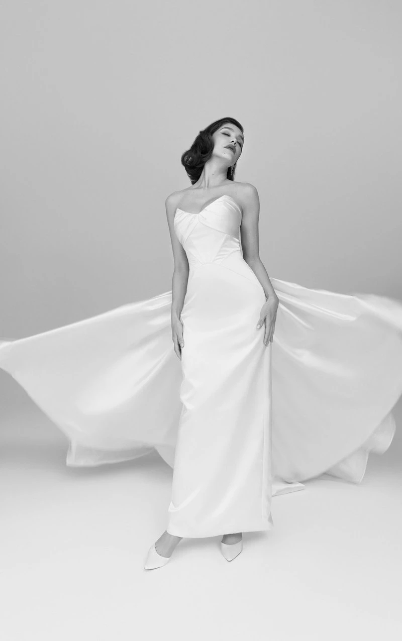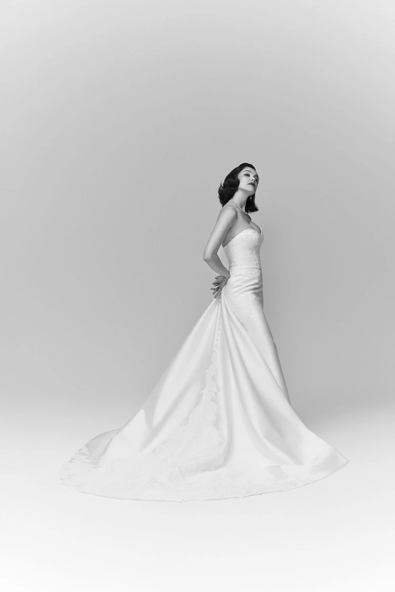 „Estelle“ Marka Ingram Bride je strapless mermaid haljina od duchesse satena s bodijem ukrašenim kristalima i metalnim nitima, odvojivom duchesse satenskom high-low bal haljinom s kapel vlakom i dostupnim odgovarajućim „Estelle“ velom.