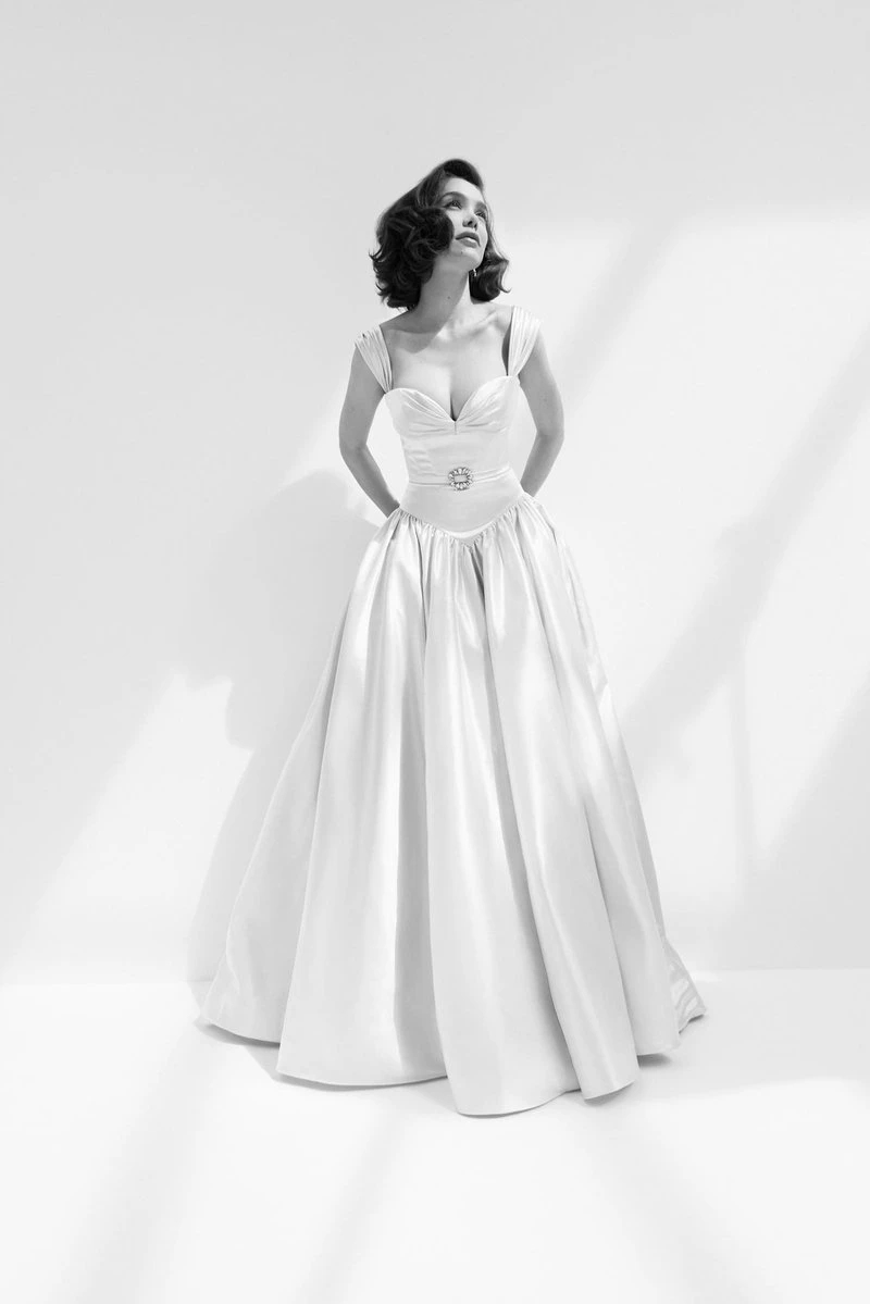 „Vivan Iola“ Marka Ingram Bride je vintage inspirisana bal haljina od duchesse satena s drapiranim grudima, odvojivim širokim konturiranim naramenicama, plitkom V-basque strukom, punom-gathered suknjom i pojasom od istog materijala s kopčom od cirkona.