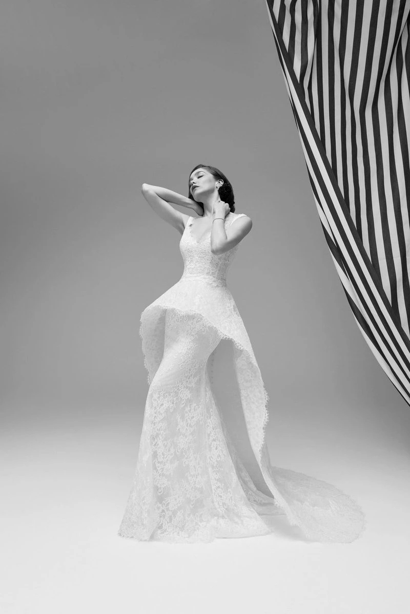 „Bessi“ Marka Ingram Bride je Alençon čipkasta haljina s dubokim V korzetom, izrezom na vrhu ramena i sirena suknjom s odvojivim stilizovanim Chantilly čipkastim peplumom s širokom Alençon čipkastom bordurom.