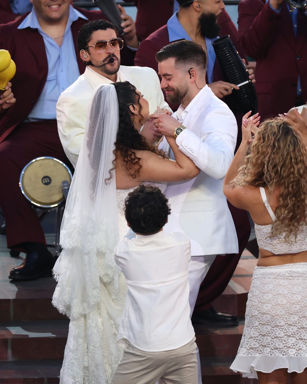 U jeku zahtjevnog nastupa — koji je uključivao ples na banderama, scenografiju bodega prodavnice, polje ispunjeno radnicima i prepoznatljivu ružičastu kućicu s njegove rezidencije iz 2025. godine u San Juanu, Portoriko — Bad Bunny je pronašao vrijeme da potpiše njihov vjenčani dokument. Nakon toga, mladenci su zajedno pojeli prvi komad svadbene torte.