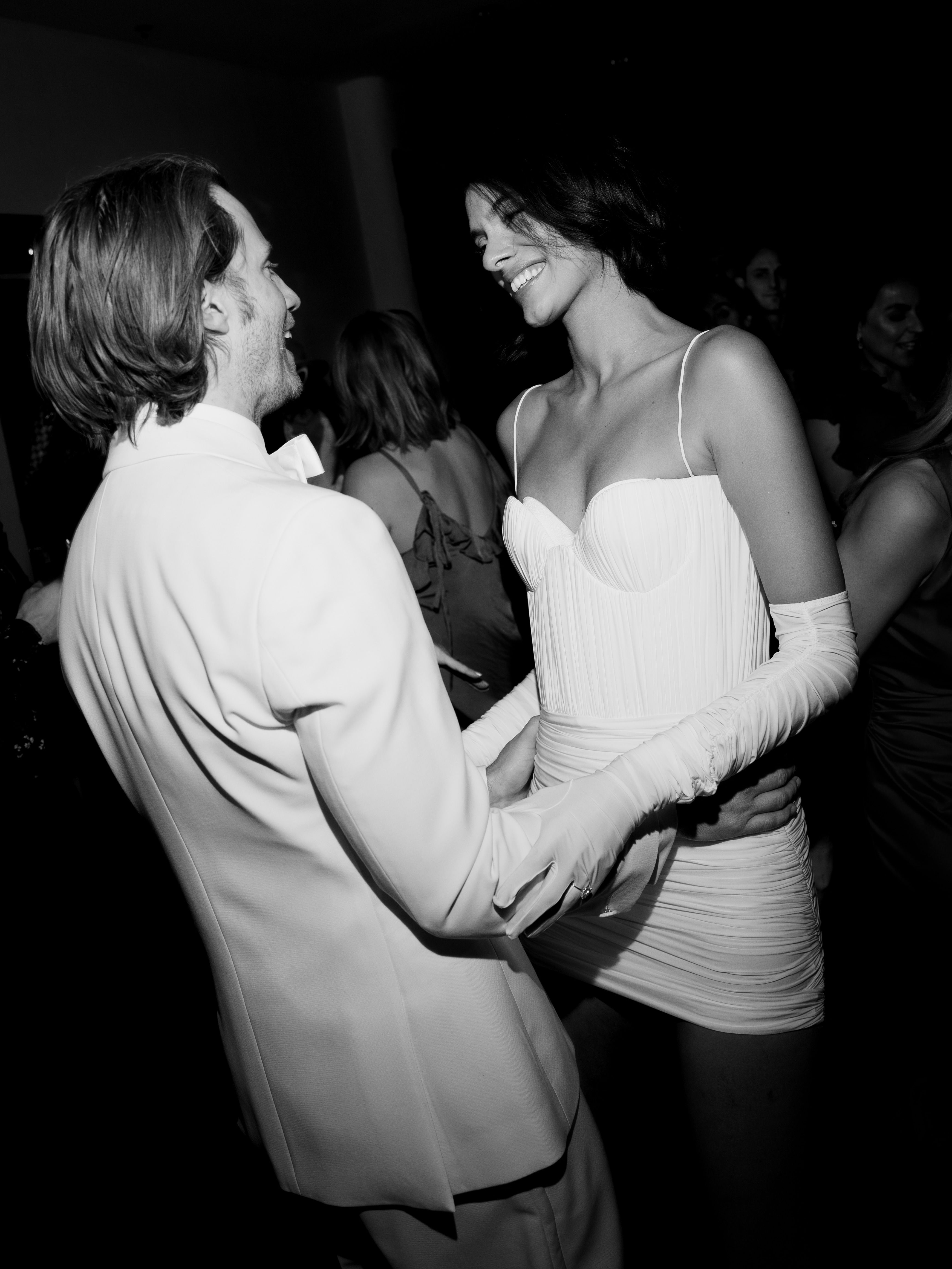 Jonathan je odabrao bijeli smoking iz Zare, uz zeleni detalj na cipelama i vintage manžete. Kasnije je plesala u minici s potpisom Alexa Perryja i bundici iz Frankie Shopa. Noć prije, oboje u ljubičastom, u stilu Beckham para.