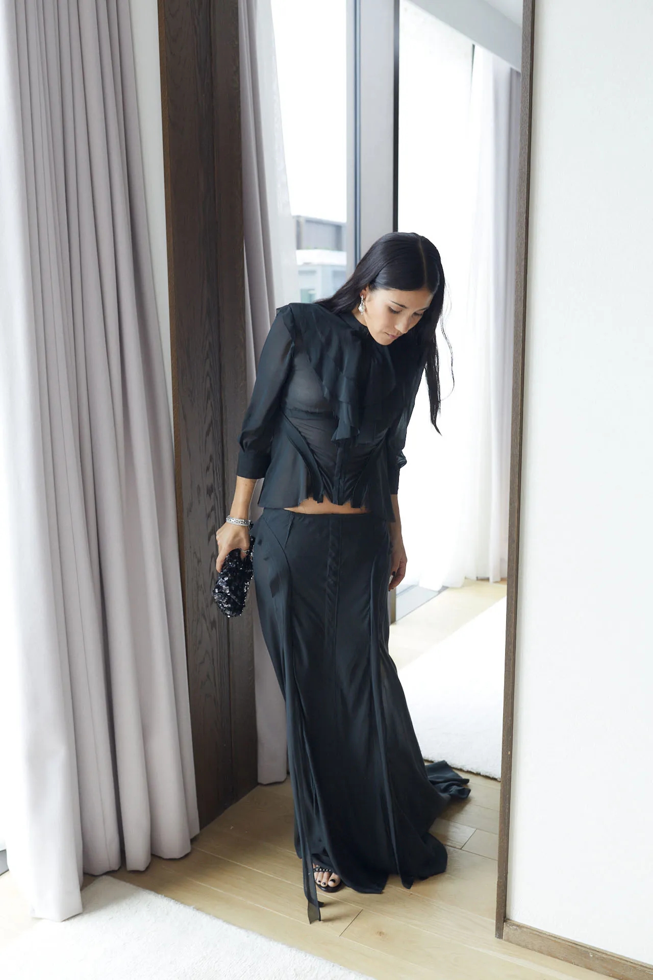 Njen stajling za ceremoniju osmislio je njujorški brend Commission, u vidu elegantnog kompleta: korzetnog topa i duge suknje od svilenog krep materijala koji se savršeno prilagođavao pokretima.