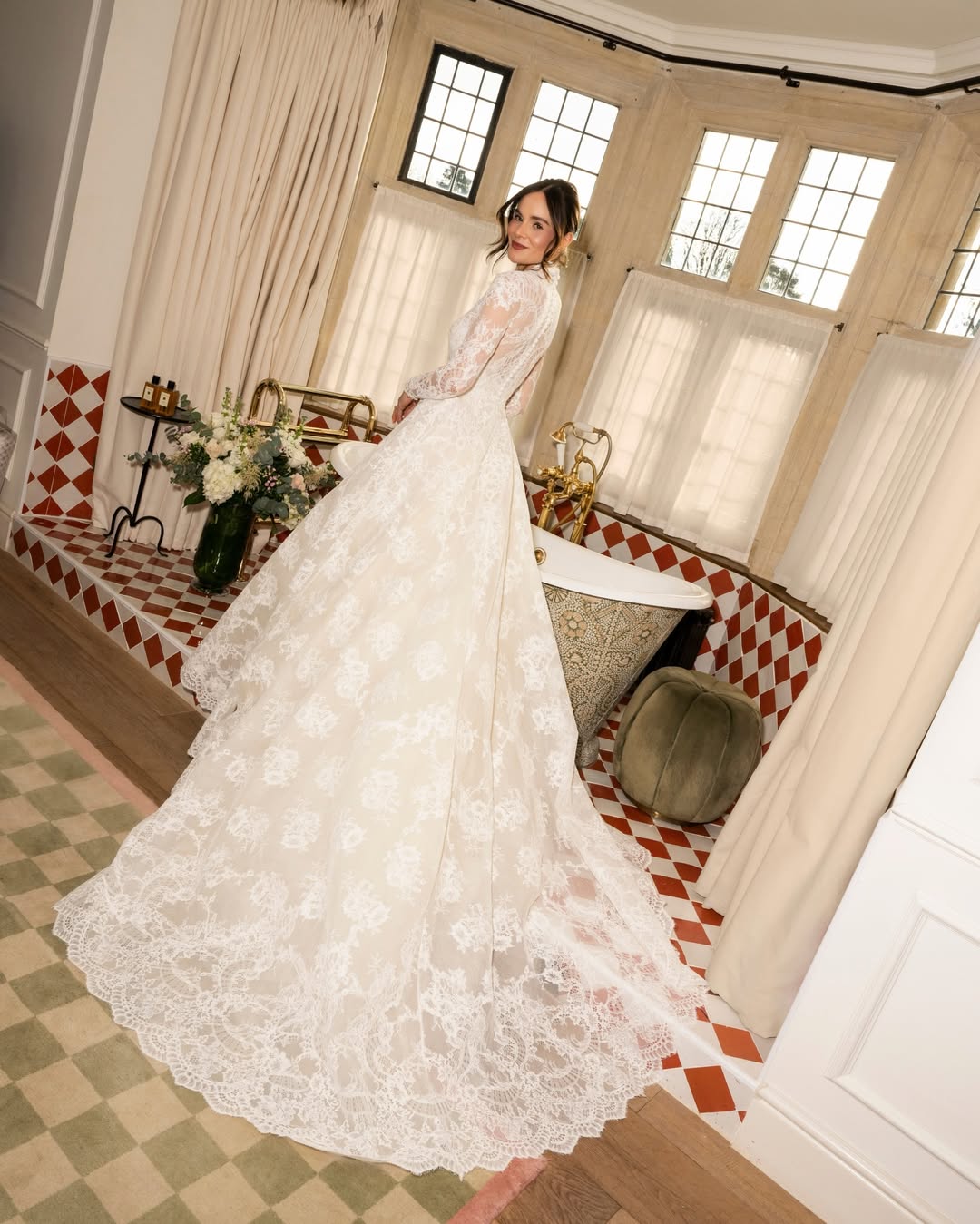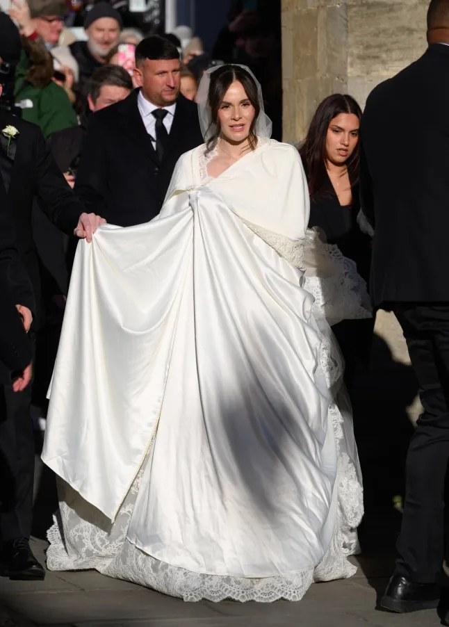Mladu je pratila želja da haljina bude duga i elegantna, pa je odabrala Elie Saab haljinu s čipkom i visokom linijom ovratnika, koja je podsjećala na stil Grace Kelly i Kate Middleton.